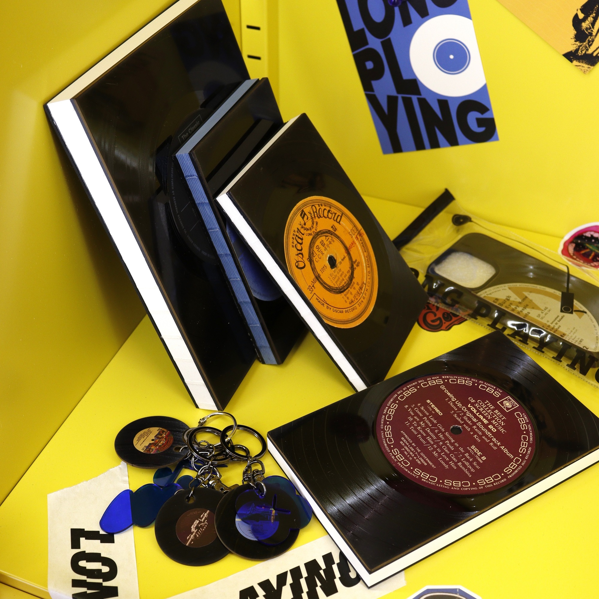 Long Playingは、LPレコードのアップサイクルブランドで、1960年代から1980年代までの廃棄されたLPを収集し再加工しています。 捨てられたLPレコードを使った様々な製品が販売されており、ノートブックやスマホケース、キーホルダーなどがあります。