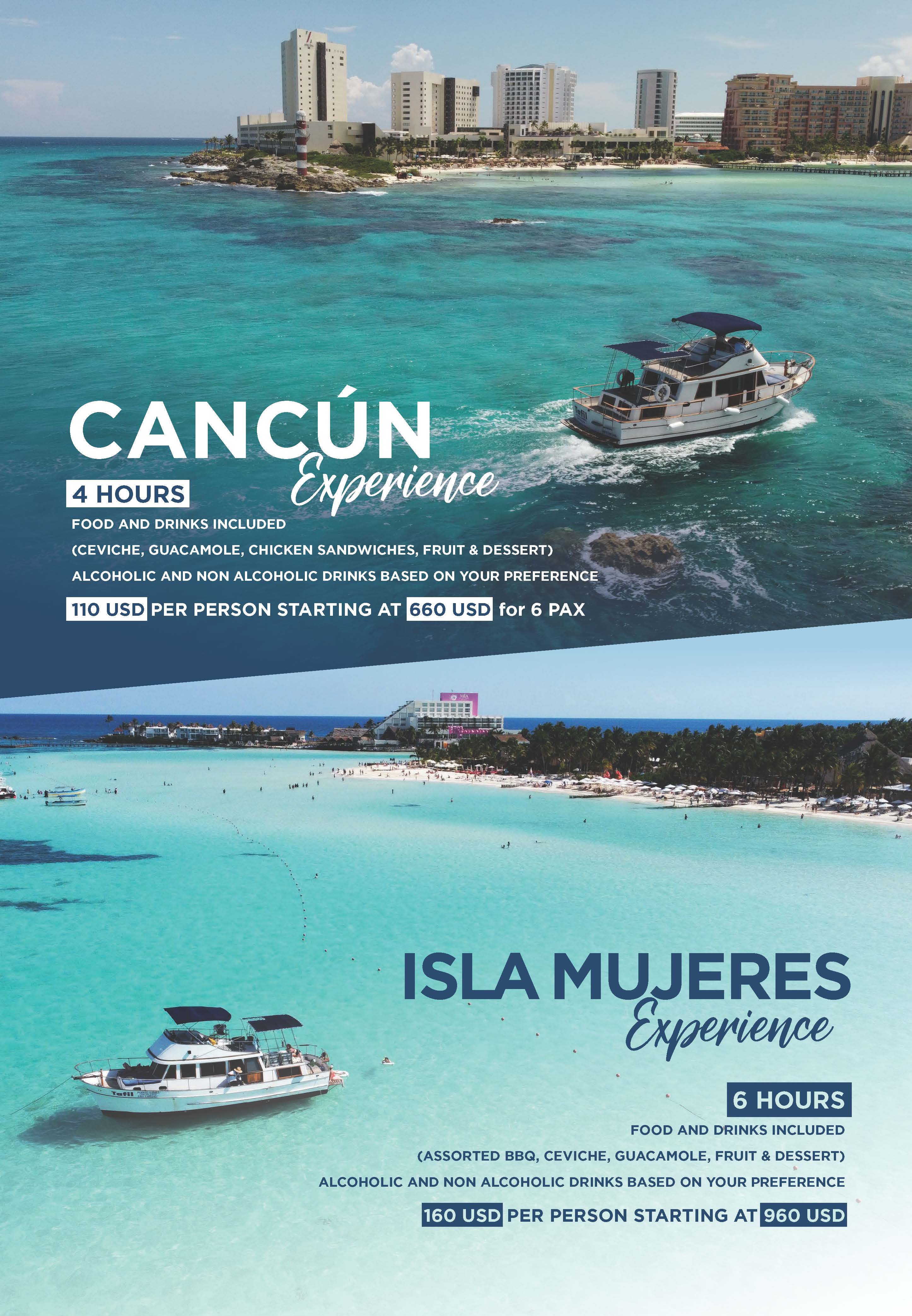 Cancun by Boat offers All-Inclusive Experiences in Cancún and Isla Mujeres. Visit the National Park, Enjoy the turquoise waters, visit the bay, lagoon and mangrove canals. Visit the Island of Isla Mujeres. Snorkeling on the reef and see the local wildlife. Swimming at stunning white sand beaches and swimming in crystalline water. Walking along busy beaches or enjoying secluded ones. A fully equipped private boat complete with music system, bathroom facilities and changing room; lifeguards present, provided with life jackets, insurance coverage as well as permits are included for your safety. Our bilingual crew is both accommodating and attentive throughout your trip.